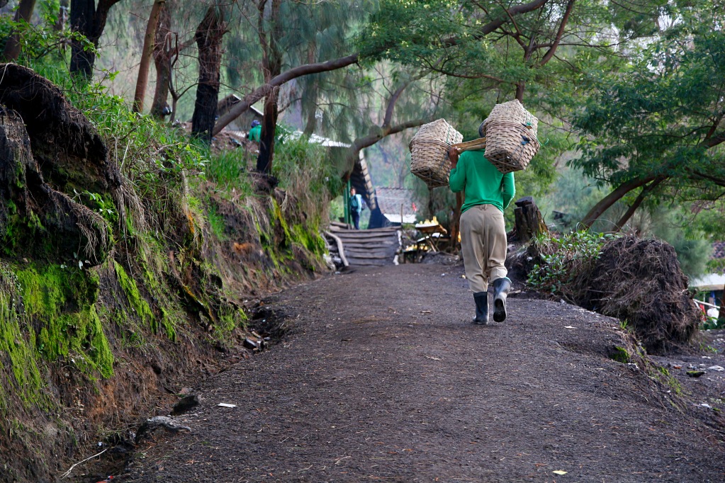 Kraatterin pohja on oiva paikka löytää rikkiä. Sitä on siellä kasoittain niin sulana kuin myös jäähtyneenä. Kiinteäksi jäähtynyt rikki hajoitetaan sopivan kokoisiksi palasiksi ja kasataan kahteen koriin, jotka on yhdistetty toisiinsa kepukalla. Kun korit on täynnä, alkaa matka ensin ylös kraatterin reunalle ja siitä alhaalla olevaan kylään. Parhaimmillaan painoa voi olla koreissa yhteensä 100 kiloa. Korit punnitaan ja työntekijöille maksetaan rikistä kilojen mukaan. Työ on rankkaa, sillä jo pelkästään kraatterille laskeutuminen ja sieltä nouseminen vaatii tarkkuutta ja ennen kaikkea voimia. Alaspäin meno on vielä ihan ok, mutta kun lähdettiin tulemaan ylöspäin, ei voinu muuta ku puuskuttaa. Kiipeämisen teki haastavaksi kaasunaamari. Otin maskin pois muutamiksi minuuteiksi, mutta rikin määrä ilmassa oli kuitenkin vielä niin suuri, että hengittäminen teki kipeää. Oltiin kyllä onnellisia, että meidän reissuun kuulu kyseiset kaasunaamarit. Paikan päällä kun oli paljon porukkaa, joilla ei ollu minkäänlaisia hengityssuojia.
